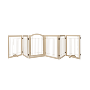 The pet gate features a solid wood frame with a metal wire interior for stable everyday use. The natural wood finish blends easily with many home interiors. Measuring 144 inches wide and 32 inches high, it provides wide coverage for larger openings and pet areas. The freestanding structure allows it to be positioned in different locations without permanent installation.