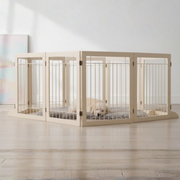 This extra-wide pet gate or playpen provides convenient access with a lockable door that allows pets to move through when opened. The 144-inch width fits large doorways, hallways, and wider spaces within the home. Its versatile six-panel design can be arranged in different shapes to match various layouts. Whether used as a gate or an enclosed playpen, this setup offers flexible placement for pet areas.